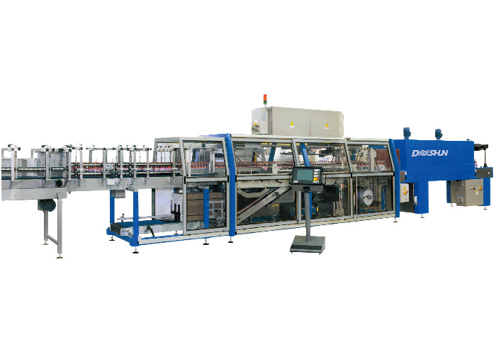 獨特的薄膜放卷裝置及薄膜恒張力輸送,薄膜瞬時切斷,自動搭接裹膜方式,收縮包裝后強度更高。